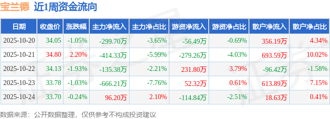 资金流向数据方面,本周宝兰德主力资金合计净流出1419.41万元,游资资金合计净流出166.46万元,散户资金合计净流入1585.87万元。本周资金流向一览见下表: