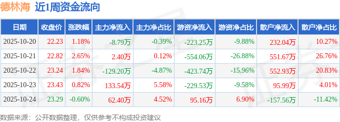 资金流向数据方面,本周德林海主力资金合计净流入60.35万元,游资资金合计净流出1335.42万元,散户资金合计净流入1275.07万元。本周资金流向一览见下表: