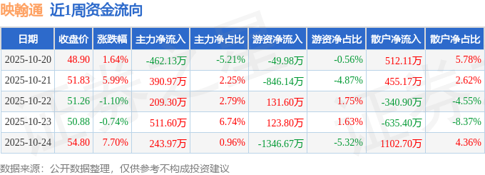 资金流向数据方面,本周映翰通主力资金合计净流入893.72万元,游资资金合计净流出1987.39万元,散户资金合计净流入1093.68万元。本周资金流向一览见下表: