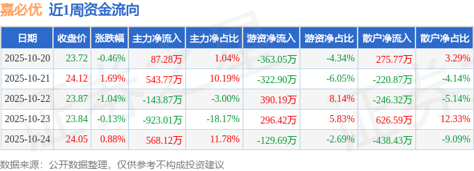 资金流向数据方面,本周嘉必优主力资金合计净流入132.28万元,游资资金合计净流出129.02万元,散户资金合计净流出3.26万元。本周资金流向一览见下表: