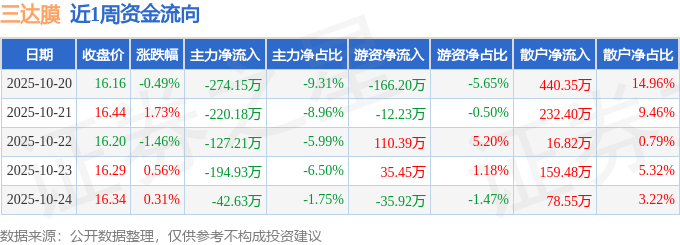 资金流向数据方面,本周三达膜主力资金合计净流出859.09万元,游资资金合计净流出68.51万元,散户资金合计净流入927.6万元。本周资金流向一览见下表: