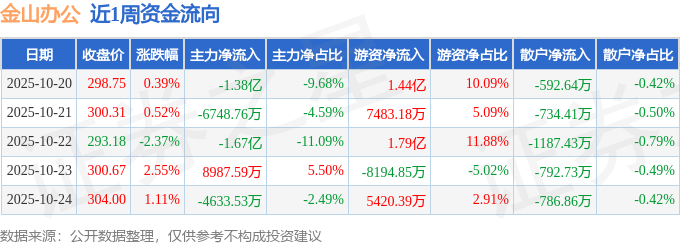 资金流向数据方面,本周金山办公主力资金合计净流出3.29亿元,游资资金合计净流入3.7亿元,散户资金合计净流出4094.09万元。本周资金流向一览见下表: