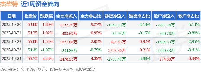 资金流向数据方面,本周杰华特主力资金合计净流入7800.73万元,游资资金合计净流出1472.74万元,散户资金合计净流出6327.99万元。本周资金流向一览见下表: