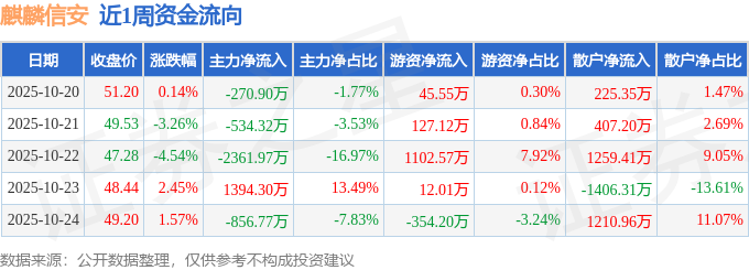 资金流向数据方面,本周麒麟信安主力资金合计净流出2629.66万元,游资资金合计净流入933.04万元,散户资金合计净流入1696.61万元。本周资金流向一览见下表: