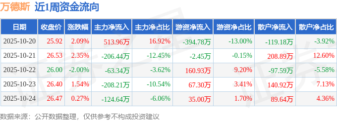 资金流向数据方面,本周万德斯主力资金合计净流出88.68万元,游资资金合计净流出134.0万元,散户资金合计净流入222.68万元。本周资金流向一览见下表: