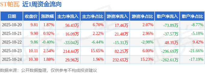 资金流向数据方面,本周ST帕瓦主力资金合计净流入283.87万元,游资资金合计净流入338.53万元,散户资金合计净流出622.41万元。本周资金流向一览见下表: