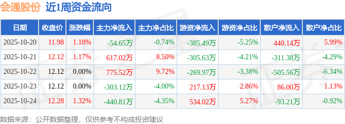 资金流向数据方面,本周会通股份主力资金合计净流入593.95万元,游资资金合计净流出209.94万元,散户资金合计净流出384.01万元。本周资金流向一览见下表: