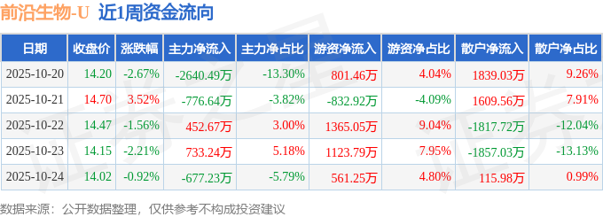 资金流向数据方面,本周前沿生物主力资金合计净流出2908.44万元,游资资金合计净流入3018.63万元,散户资金合计净流出110.19万元。本周资金流向一览见下表: