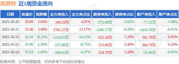 资金流向数据方面,本周英诺特主力资金合计净流入1033.82万元,游资资金合计净流出458.52万元,散户资金合计净流出575.3万元。本周资金流向一览见下表: