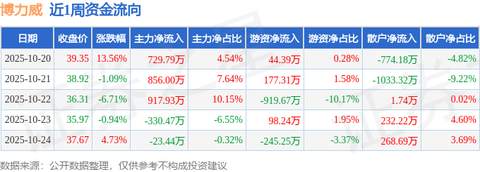 资金流向数据方面,本周博力威主力资金合计净流入2149.83万元,游资资金合计净流出844.98万元,散户资金合计净流出1304.84万元。本周资金流向一览见下表: