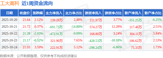 资金流向数据方面,本周工大高科主力资金合计净流出480.56万元,游资资金合计净流入228.28万元,散户资金合计净流入252.28万元。本周资金流向一览见下表: