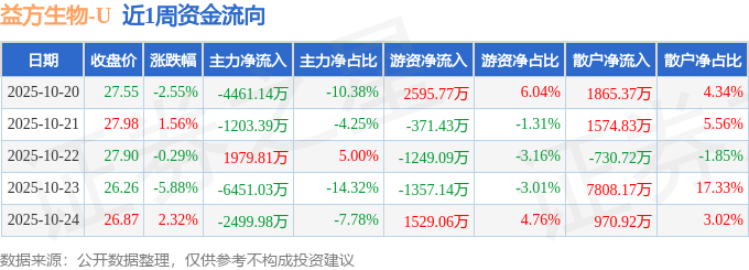 资金流向数据方面,本周益方生物主力资金合计净流出1.26亿元,游资资金合计净流入1147.17万元,散户资金合计净流入1.15亿元。本周资金流向一览见下表: