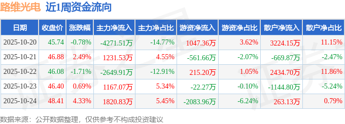 资金流向数据方面,本周路维光电主力资金合计净流出2701.98万元,游资资金合计净流出1405.33万元,散户资金合计净流入4107.31万元。本周资金流向一览见下表: