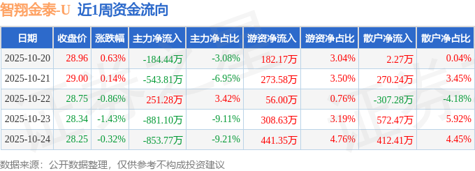 资金流向数据方面,本周智翔金泰主力资金合计净流出2211.84万元,游资资金合计净流入1261.74万元,散户资金合计净流入950.1万元。本周资金流向一览见下表: