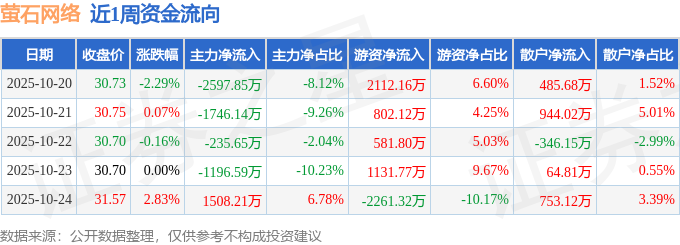 资金流向数据方面,本周萤石网络主力资金合计净流出4268.01万元,游资资金合计净流入2366.52万元,散户资金合计净流入1901.49万元。本周资金流向一览见下表: