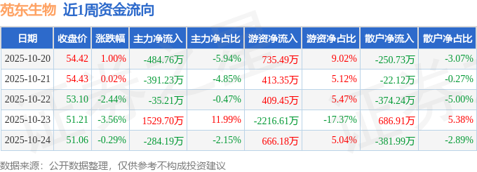 资金流向数据方面,本周苑东生物主力资金合计净流入334.31万元,游资资金合计净流入7.86万元,散户资金合计净流出342.17万元。本周资金流向一览见下表: