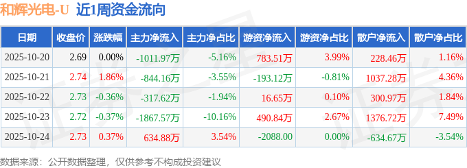 资金流向数据方面,本周和辉光电主力资金合计净流出3406.44万元,游资资金合计净流入1097.67万元,散户资金合计净流入2308.77万元。本周资金流向一览见下表: