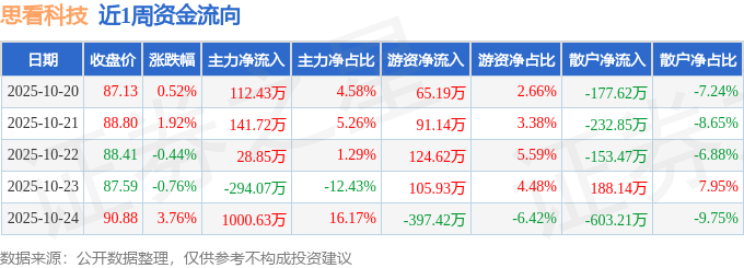 资金流向数据方面,本周思看科技主力资金合计净流入989.56万元,游资资金合计净流出10.55万元,散户资金合计净流出979.01万元。本周资金流向一览见下表: