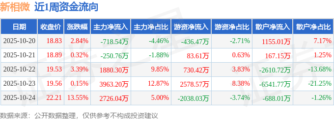 资金流向数据方面,本周新相微主力资金合计净流入7600.24万元,游资资金合计净流入918.1万元,散户资金合计净流出8518.34万元。本周资金流向一览见下表: