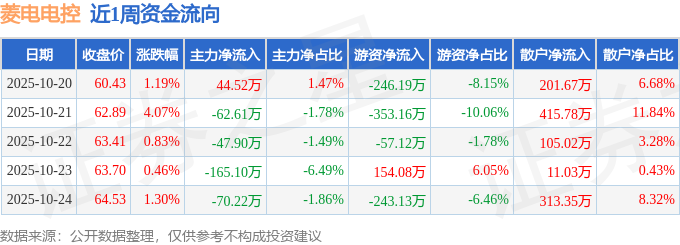 资金流向数据方面,本周菱电电控主力资金合计净流出301.31万元,游资资金合计净流出745.53万元,散户资金合计净流入1046.84万元。本周资金流向一览见下表: