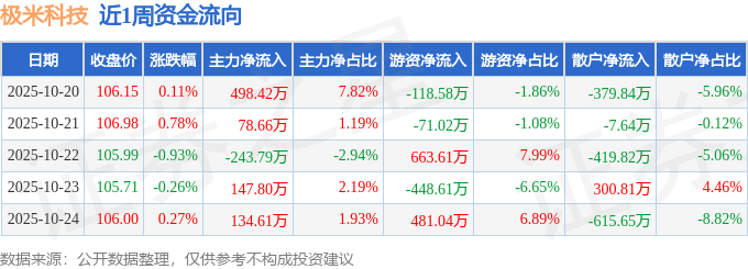 资金流向数据方面,本周极米科技主力资金合计净流入615.7万元,游资资金合计净流入506.44万元,散户资金合计净流出1122.14万元。本周资金流向一览见下表:
