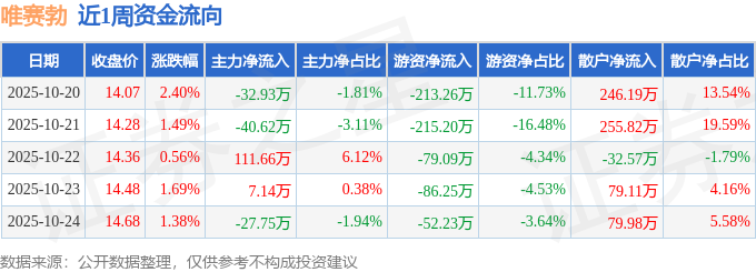 资金流向数据方面,本周唯赛勃主力资金合计净流入17.5万元,游资资金合计净流出646.02万元,散户资金合计净流入628.52万元。本周资金流向一览见下表: