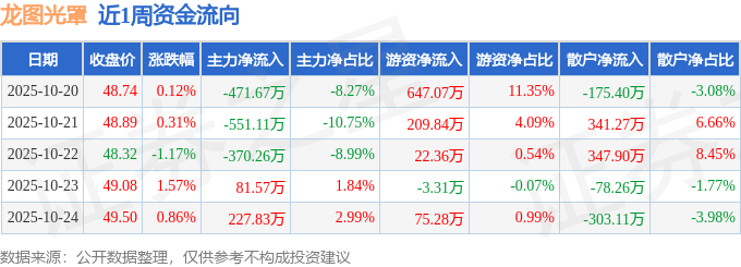 资金流向数据方面,本周龙图光罩主力资金合计净流出1083.65万元,游资资金合计净流入951.25万元,散户资金合计净流入132.4万元。本周资金流向一览见下表: