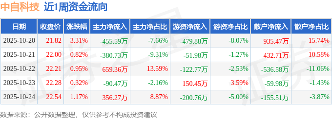 资金流向数据方面,本周中自科技主力资金合计净流入88.84万元,游资资金合计净流出704.94万元,散户资金合计净流入616.1万元。本周资金流向一览见下表: