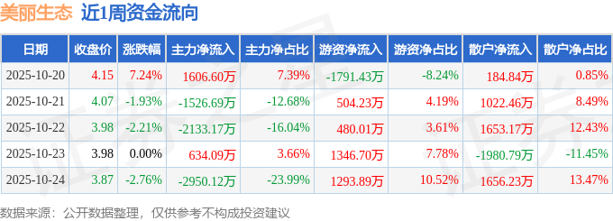 资金流向数据方面,本周美丽生态主力资金合计净流出4369.29万元,游资资金合计净流入1833.4万元,散户资金合计净流入2535.89万元。本周资金流向一览见下表: