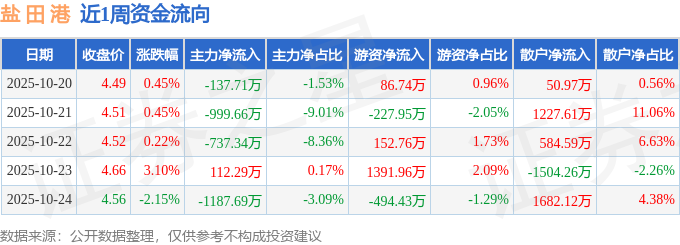 沪深股通持股方面,截止2025年10月24日收盘,盐 田 港深股通持股数为2099.76万股,占流通股比为93.0%。