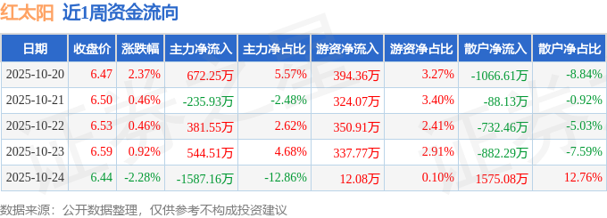 资金流向数据方面,本周红太阳主力资金合计净流出224.78万元,游资资金合计净流入1419.19万元,散户资金合计净流出1194.41万元。本周资金流向一览见下表: