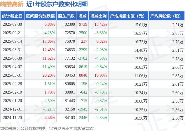 证券之星消息,近日皖维高新披露,截至2025年9月30日公司股东户数为8.23万户,较9月21日增加9739.0户,增幅为13.42%。户均持股数量由上期的2.85万股减少至2.51万股,户均持股市值为15.61万元。