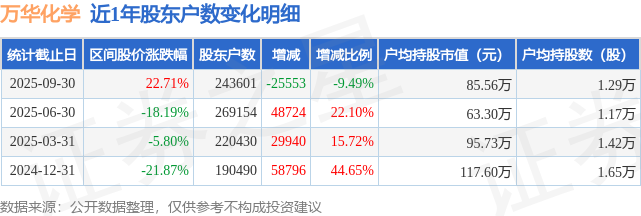 从股价来看,2025年6月30日至2025年9月30日,万华化学区间涨幅为22.71%,在此期间股东户数减少2.56万户,减幅为9.49%。