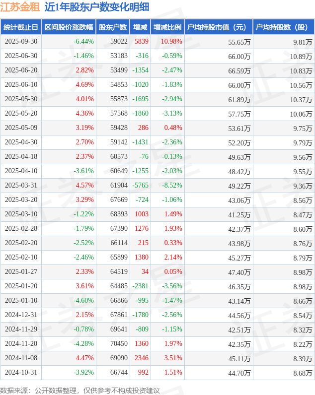 从股价来看,2025年6月30日至2025年9月30日,江苏金租区间跌幅为6.44%,在此期间股东户数增加5839.0户,增幅为10.98%。