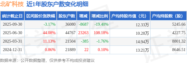 从股价来看,2025年6月30日至2025年9月30日,北矿科技区间跌幅为3.17%,在此期间股东户数减少8687.0户,减幅为19.4%。
