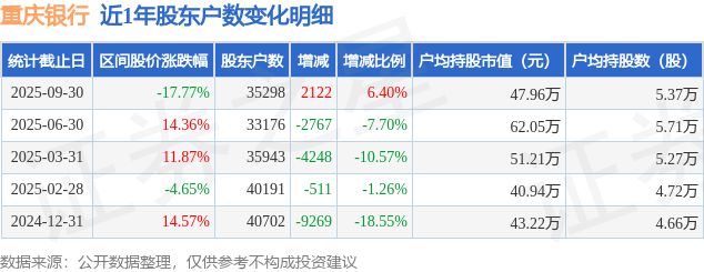 证券之星消息,近日重庆银行披露,截至2025年9月30日公司股东户数为3.53万户,较6月30日增加2122.0户,增幅为6.4%。户均持股数量由上期的5.71万股减少至5.37万股,户均持股市值为47.96万元。