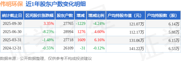 从股价来看,2025年6月30日至2025年9月30日,伟明环保区间涨幅为3.35%,在此期间股东户数减少1229.0户,减幅为4.24%。