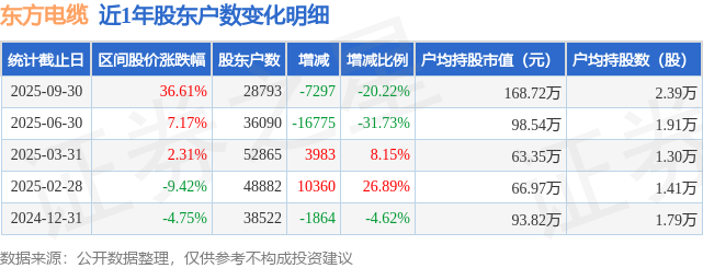 从股价来看,2025年6月30日至2025年9月30日,东方电缆区间涨幅为36.61%,在此期间股东户数减少7297.0户,减幅为20.22%。