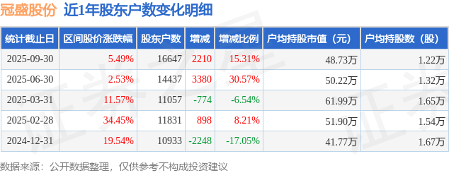 从股价来看,2025年6月30日至2025年9月30日,冠盛股份区间涨幅为5.49%,在此期间股东户数增加2210.0户,增幅为15.31%。