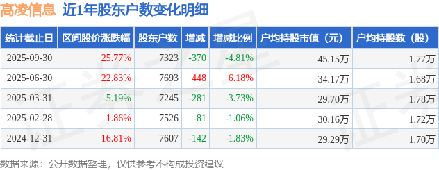 从股价来看,2025年6月30日至2025年9月30日,高凌信息区间涨幅为25.77%,在此期间股东户数减少370.0户,减幅为4.81%。