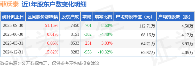 从股价来看,2025年6月30日至2025年9月30日,菲沃泰区间涨幅为51.15%,在此期间股东户数减少701.0户,减幅为8.6%。