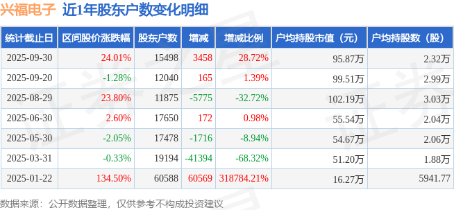 从股价来看,2025年9月20日至2025年9月30日,兴福电子区间涨幅为24.01%,在此期间股东户数增加3458.0户,增幅为28.72%。