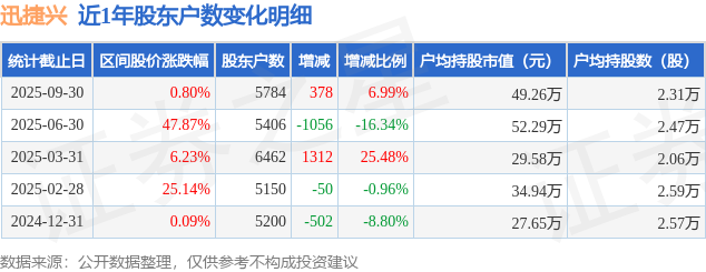 从股价来看,2025年6月30日至2025年9月30日,迅捷兴区间涨幅为0.8%,在此期间股东户数增加378.0户,增幅为6.99%。