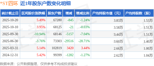 从股价来看,2025年10月10日至2025年10月20日,*ST四环区间涨幅为5.49%,在此期间股东户数减少845.0户,减幅为1.24%。