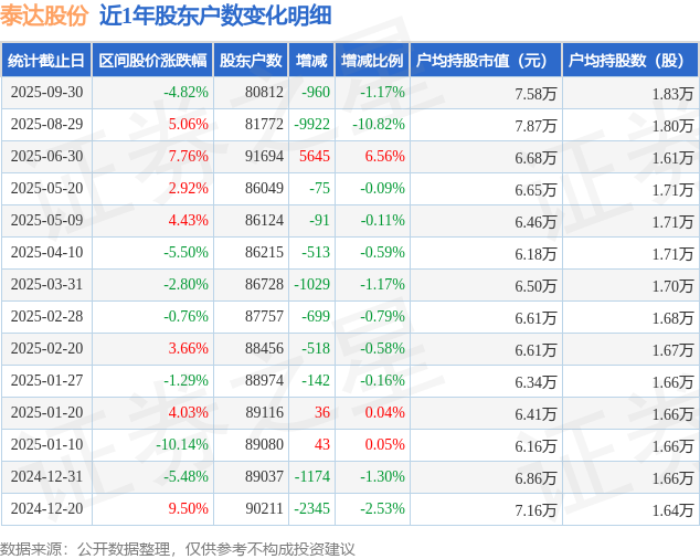从股价来看,2025年8月29日至2025年9月30日,泰达股份区间跌幅为4.82%,在此期间股东户数减少960.0户,减幅为1.17%。