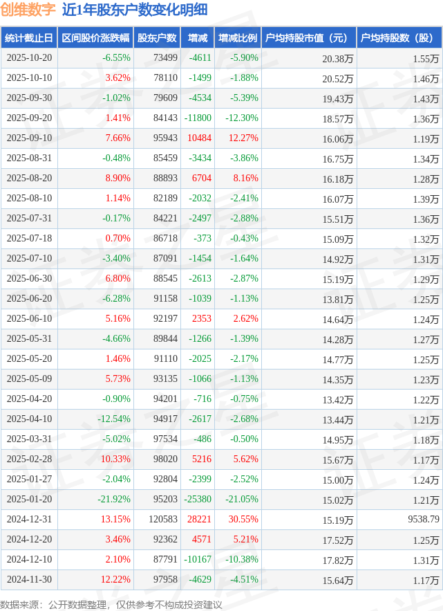 从股价来看,2025年10月10日至2025年10月20日,创维数字区间跌幅为6.55%,在此期间股东户数减少4611.0户,减幅为5.9%。