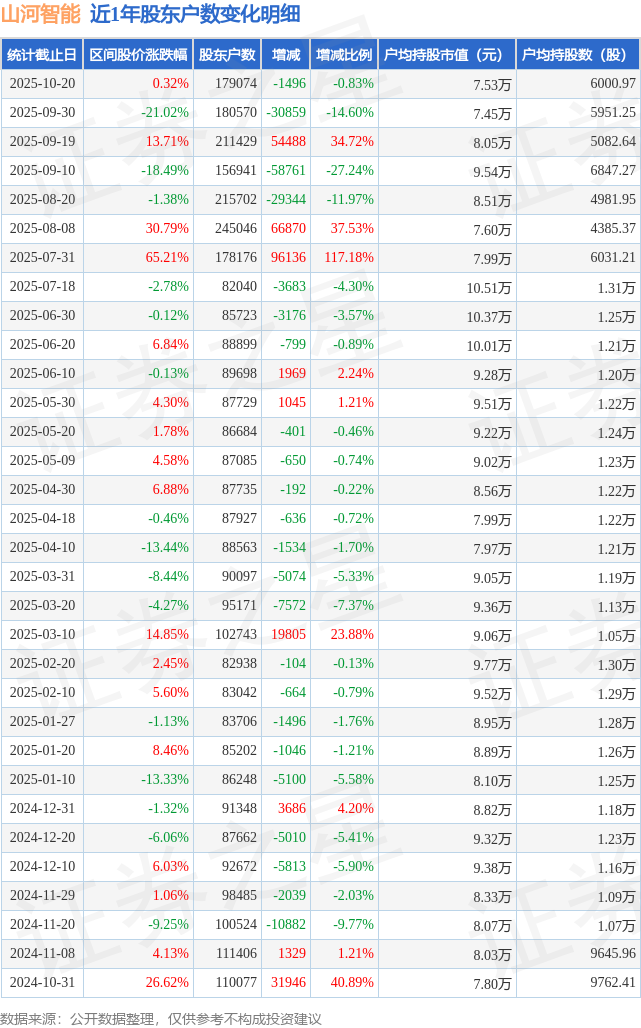 从股价来看,2025年9月30日至2025年10月20日,山河智能区间涨幅为0.32%,在此期间股东户数减少1496.0户,减幅为0.83%。