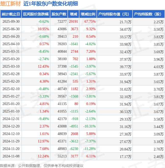 从股价来看,2025年6月30日至2025年9月30日,楚江新材区间跌幅为0.62%,在此期间股东户数增加2.92万户,增幅为67.75%。