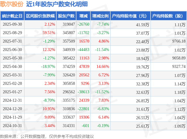 证券之星消息,近日歌尔股份披露,截至2025年9月30日公司股东户数为31.9万户,较8月29日减少2.68万户,减幅为7.74%。户均持股数量由上期的1.01万股增加至1.11万股,户均持股市值为41.59万元。