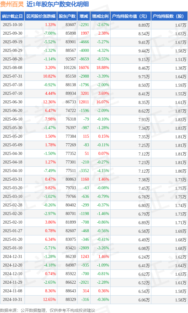 从股价来看,2025年9月30日至2025年10月10日,贵州百灵区间涨幅为1.33%,在此期间股东户数减少2291.0户,减幅为2.67%。